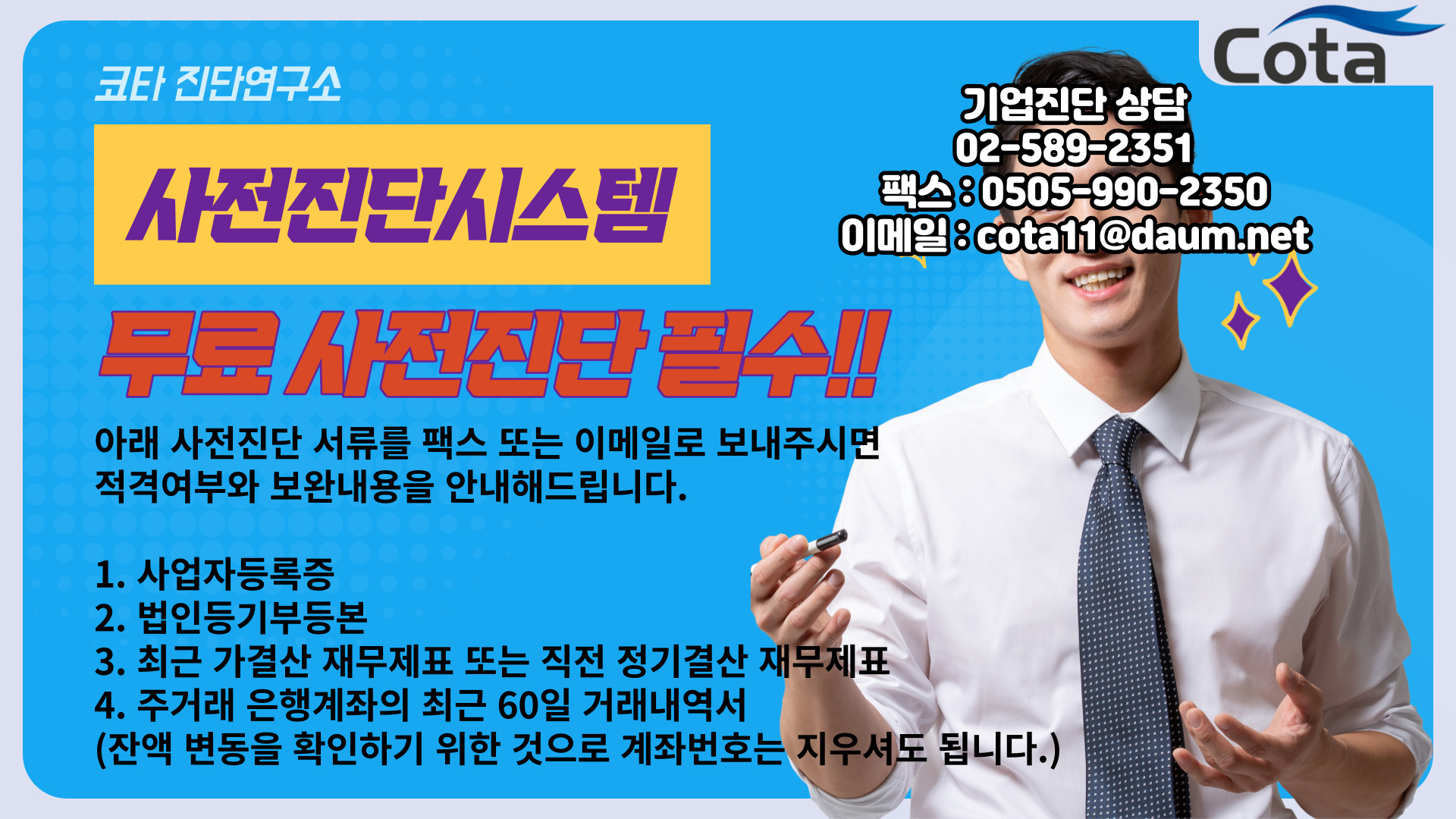 적격요건을 갖추기 위한 준비는 사전에 회사의 재무상태를 검토할 능력이 있어야 합니다. 그러나 기업진단이 너무 전문적인 영역이므로 업체에서 스스로 진단하기에는 무리가 있습니다. 따라서 저희는 아래의 자료를 통해 무료로 사전진단을 해드리고 있습니다. 많은 이용 바랍니다.